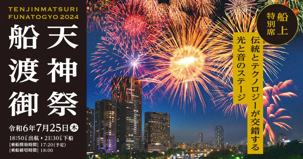 「船渡御」「奉納花火」を間近で観覧できるほか、船上イベントも楽しむことができる特別観覧席チケットが販売される。販売元は大阪が創業の地となるジーピーオンライン。担当者は「船上からは、天神祭の賑わいを感じながら迫力の花火を直近で鑑賞できる、陸地とはまた違った天神祭を体験することができる」と話している。
