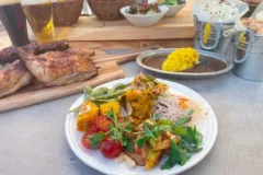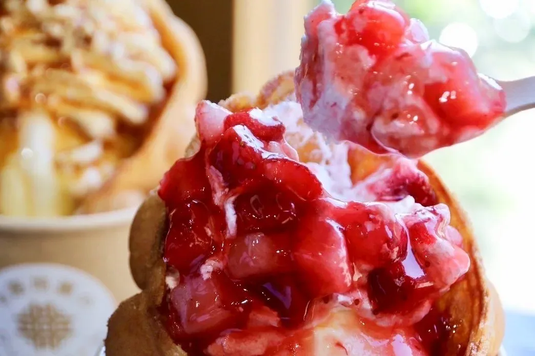 暑い季節におすすめ「ワッフルアイス」(税込580円~)は、フレーバーを多種類用意。来店客は「もちもち食感でほんのり甘いワッフルとアイスが相性抜群♪ 」とうれしそう。ほかにもホイップクリームたっぷりのクレープやカスタードブリュレなどが並ぶ。営業時間は午後2時から午前0時まで。地元客がおやつや夕食後のデザートに訪れる。