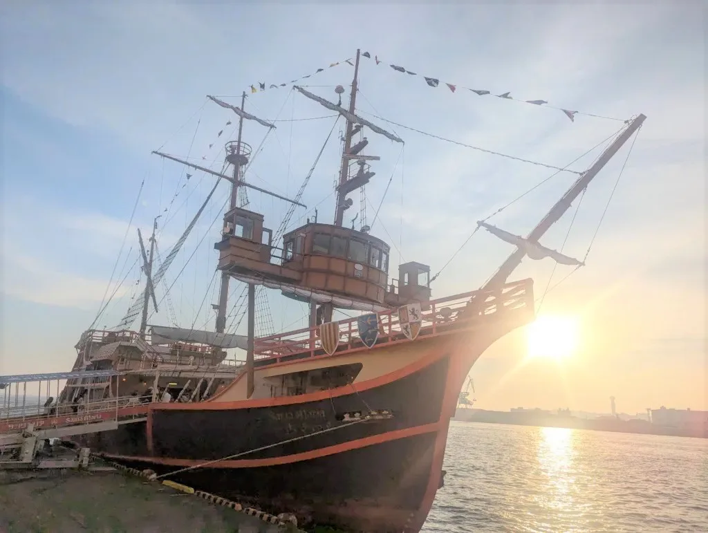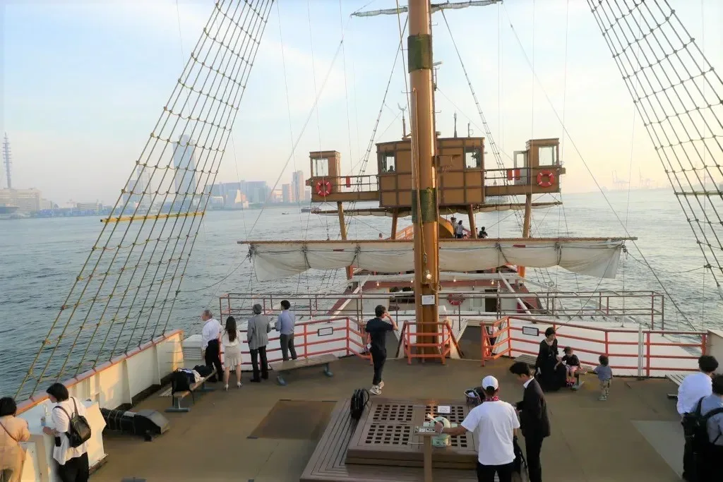 サンタマリア号はアメリカ大陸を発見したコロンブスの旗艦をモチーフに、約2倍の大きさで、船の中央にある大きな帆が特徴の日本では珍しい帆船型観光船。海に沈む夕日を1階から4階まで4カ所ある開放感のあるデッキなどから、心地よい風を受けながら堪能できる。