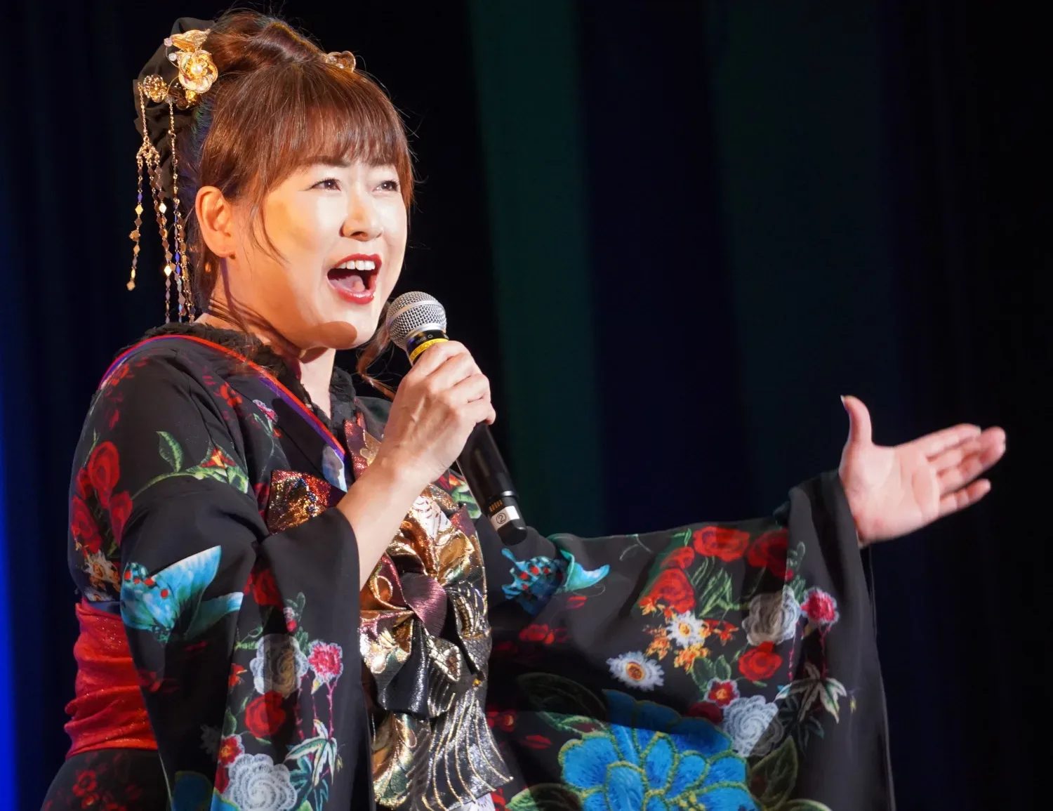 大阪・南河内地区の羽曳野市在住、演歌歌手・浅田あつこが地元で開催の7月度「大阪発流行歌ライブ」に出演。トリで登場しメジャーデビュー30周年記念曲「道行き」を花魁(おいらん)姿で熱唱した。
