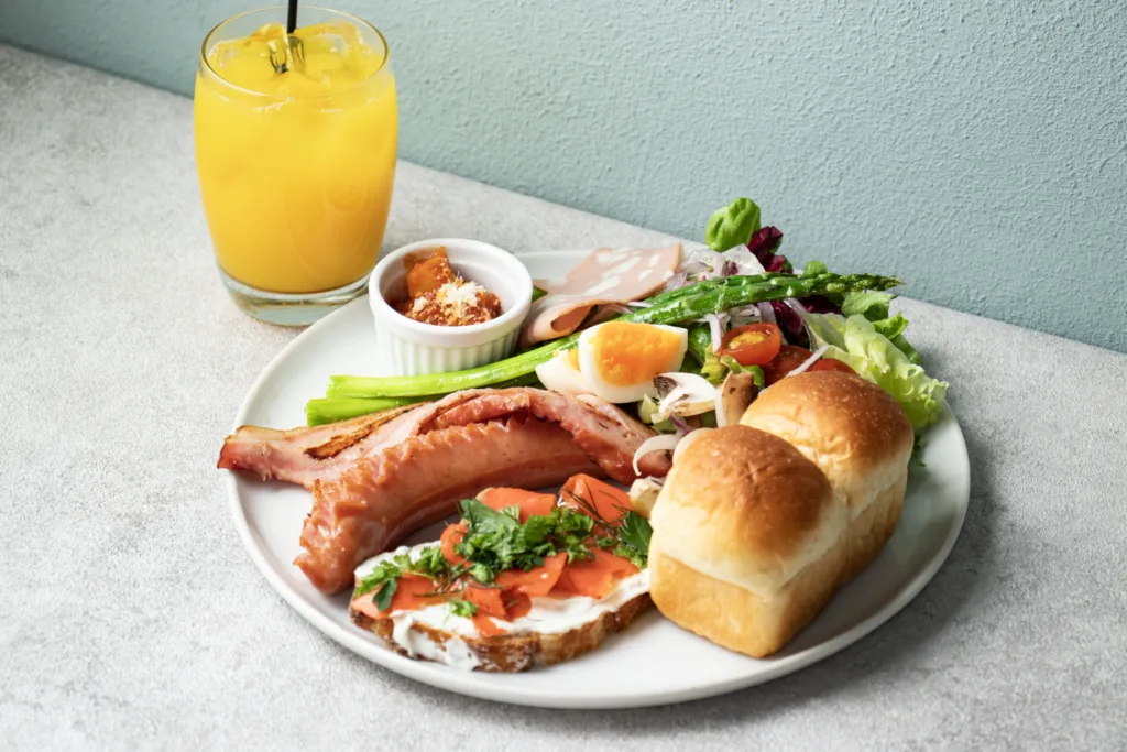 土日祝限定のモーニングは、湯だねパンと淡路野菜とソーセージグリル、イタリアンハムに煮込んだ料理など季節で変わるモーニングプレートと、肉厚のフレンチトーストに季節のフルーツをのせた2種があり、エネルギーチャージができそうだ。