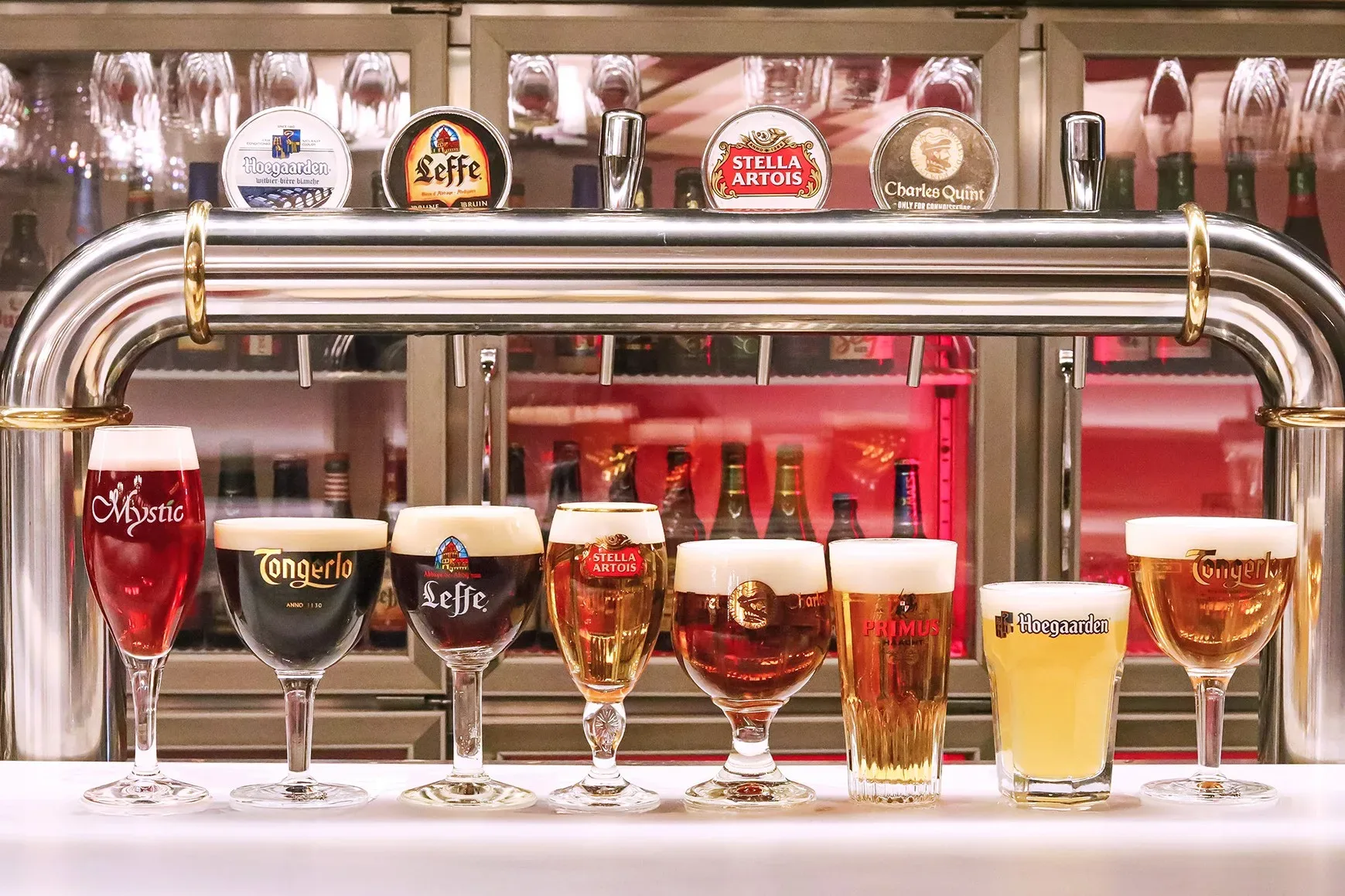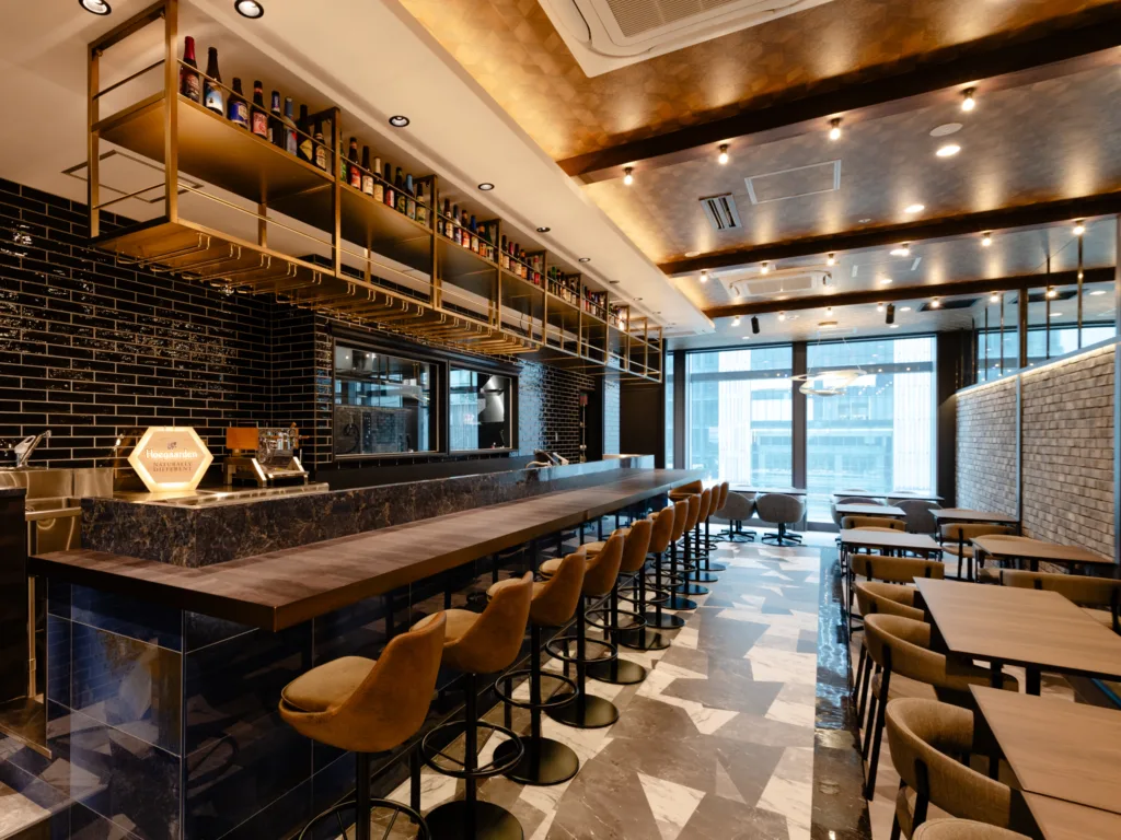 カウンターに設置したビールタップには、さわやかな飲み口の「ヒューガルデン」やドライな味わいの「シメイ・ホワイト」、フルーティーな酸味と甘みの「ミスティック チェリーorピーチ」などベルギーを代表する7銘柄を樽生でラインナップ。