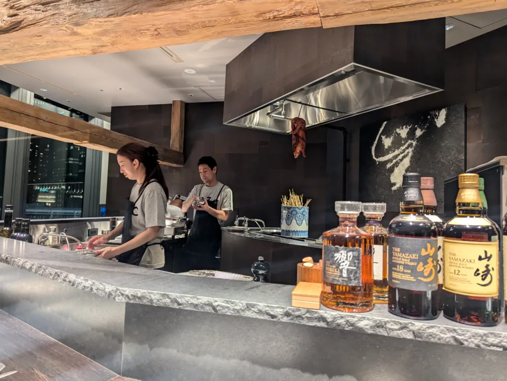 古木を生かしたインテリアで、照明の明るさを抑えた隠れ家のような店内には、シェフを囲むように配置した9つのカウンター席を配置。料理のライブパフォーマンスをどの席からも体験できる。壁一面の大きなガラス窓からは、開発のラストスパートが進む「グラングリーン大阪(うめきた2期)」が一望できる。
