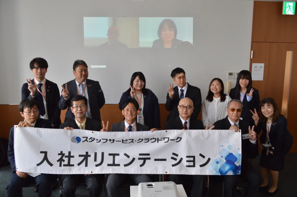 入社式は、各所からの挨拶の後、先輩社員からのビデオメッセージや自己紹介、チームビルディングなどのプログラムが組まれている。