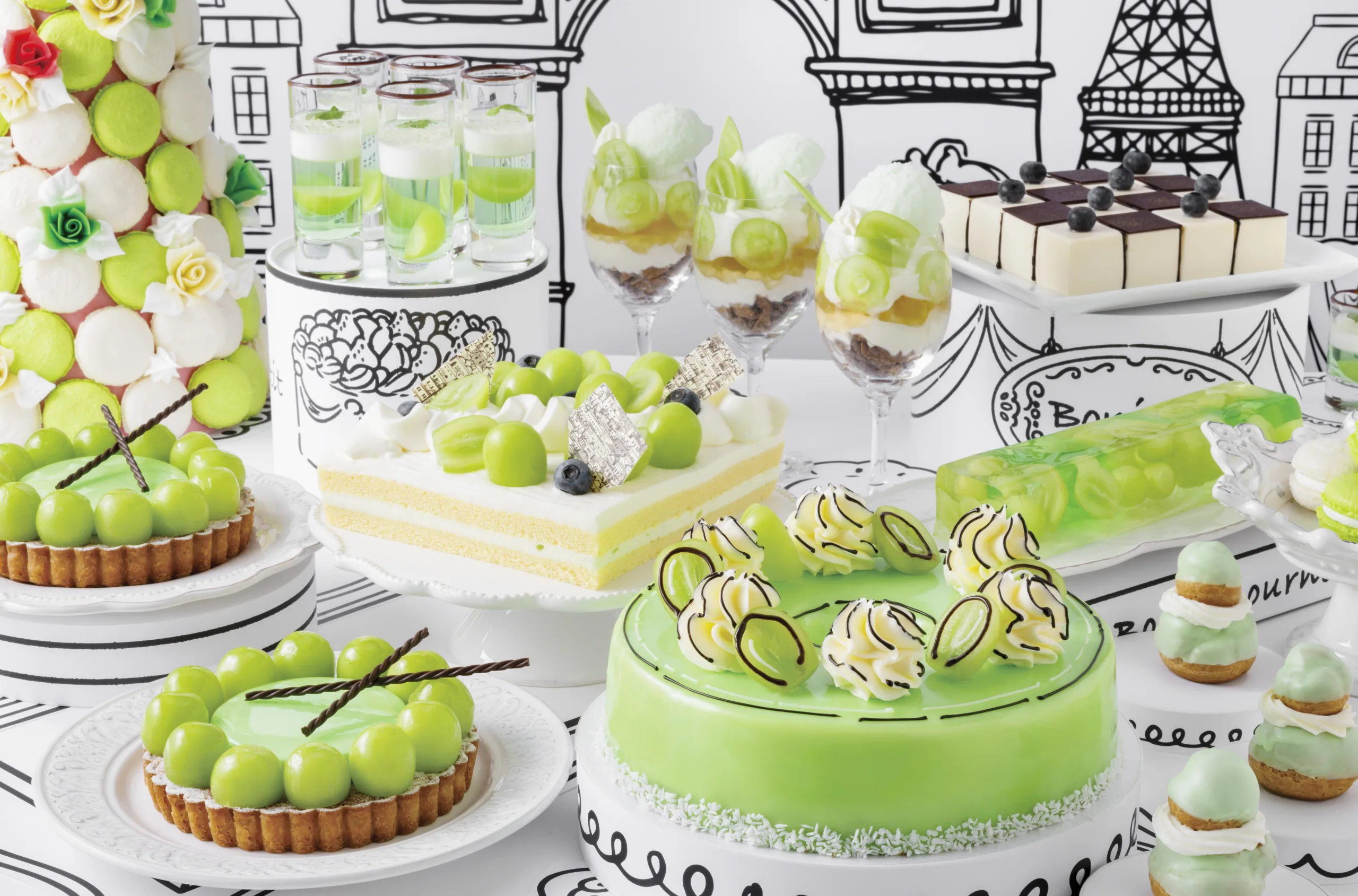 シャインマスカットを贅沢に使用したスイーツや、まるで絵の中から飛び出してきたようなパリの雰囲気漂う2Dの世界観を楽しめるスイーツ全20種が登場する。スタンドクッキングで一人ずつ目の前で仕上げる「シャインマスカットのミニパフェ」は、食べ進めるごとに溶け出すマスカットのジェラートや、ベルベーヌ香るすっきりとした甘さのジュレなど、味わいと食感の変化にハマるという。