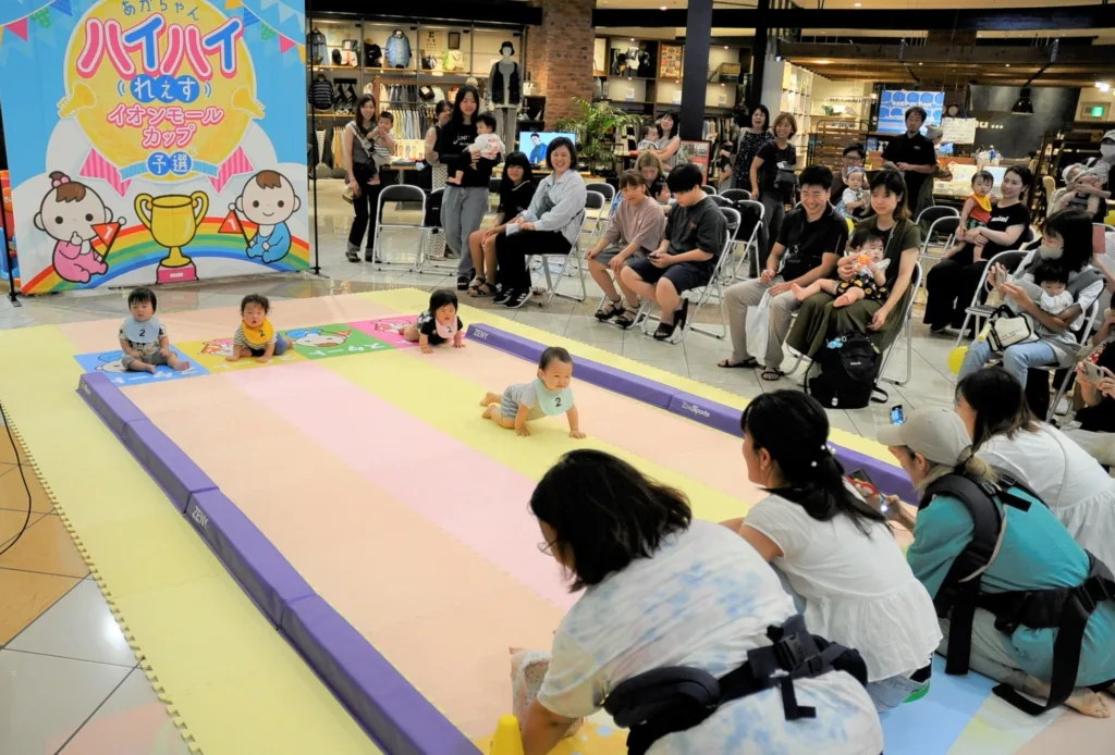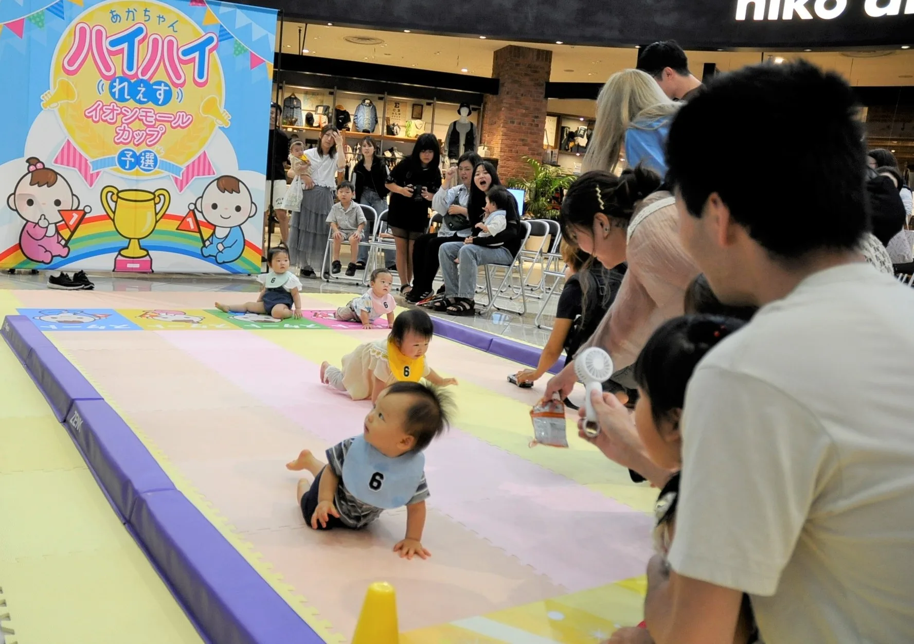 イオンモール四條畷、茨木、鶴見緑地、大日がそれぞれ実施している、歩行前赤ちゃん(概ね1歳未満)のハイハイを競う「あかちゃんハイハイれぇす」がこのほど、初めて4つのモール合同で開催している。