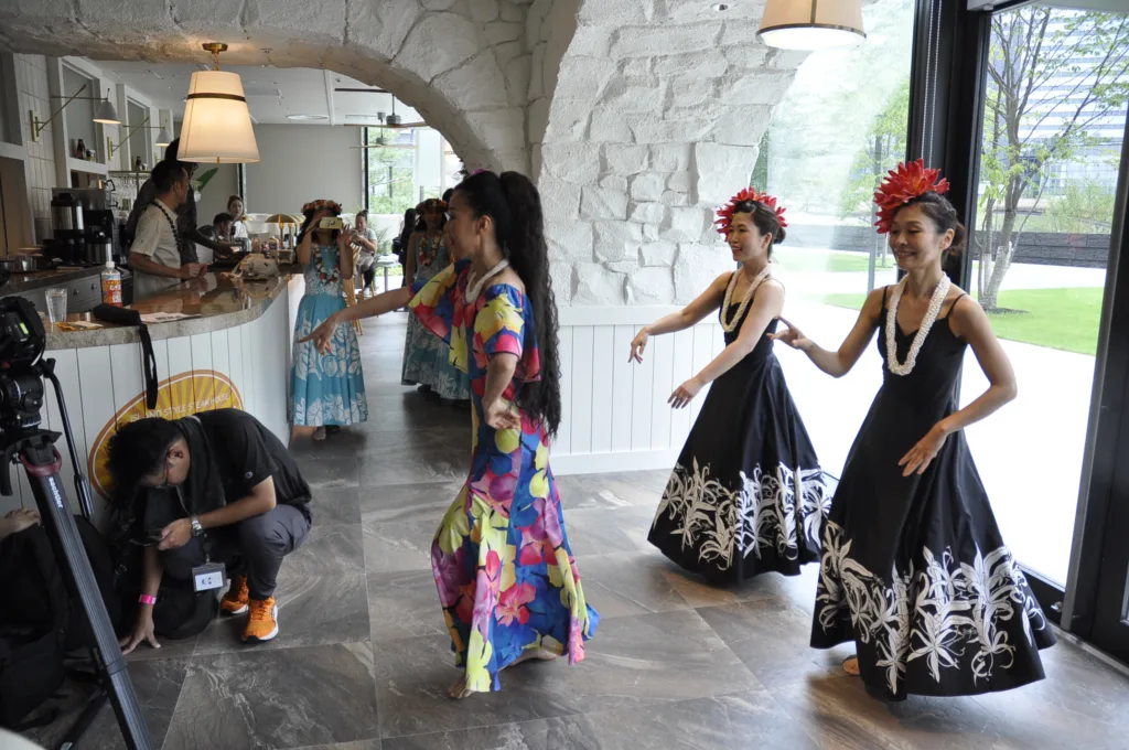 関西初上陸する、ハワイの人気店。週末にはフラダンスやウクレレショーも予定されているそうで、内覧会当日にも披露された。