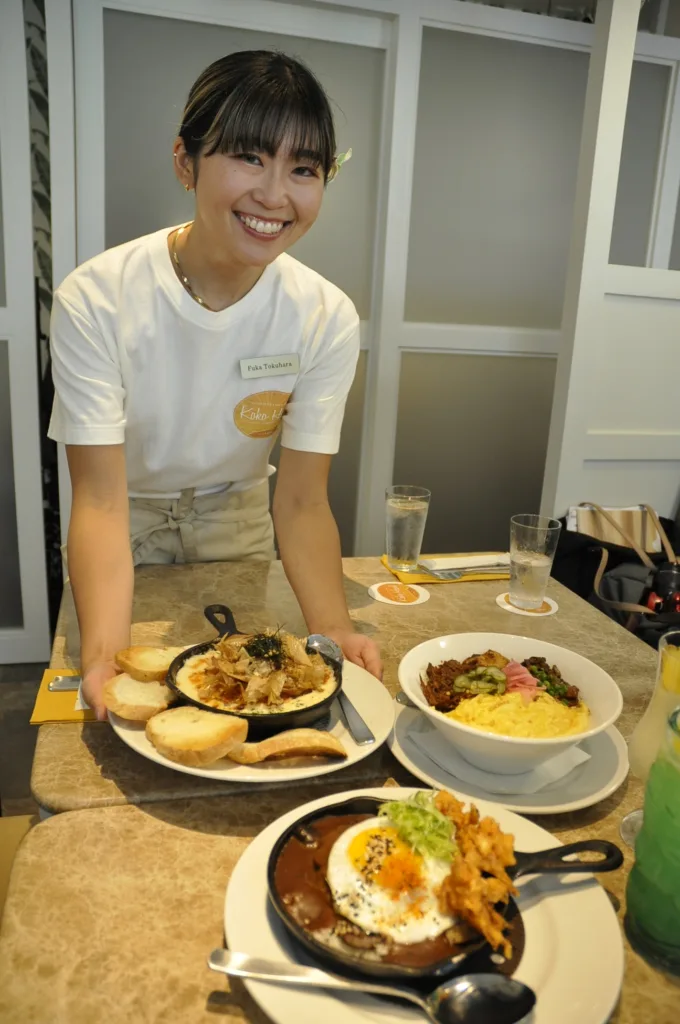 食事は、ロコモコにキムチの天ぷらをトッピングした「ココモコ」をまずチョイス。「肉々しい」味がたまらない。