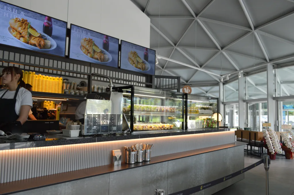 ハンバーガーや麻婆豆腐、クラフトビールなど、バラエティ豊富な飲食店が集まるシェア型フードホールで、5店舗85席を展開。モバイルオーダーやキャッシュレス決済などのデジタル技術を活用し、テーブルから全ての店舗の商品を注文でき、支払いもテーブル単位でまとめることが可能。