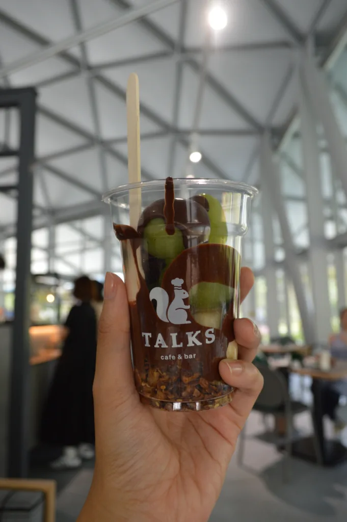 こちらでは、おやつ時にぴったりな「チョコレートドレープ」を実食。果物のおいしさがチョコによって引き立っていた。公園横というロケーションも心地いい。