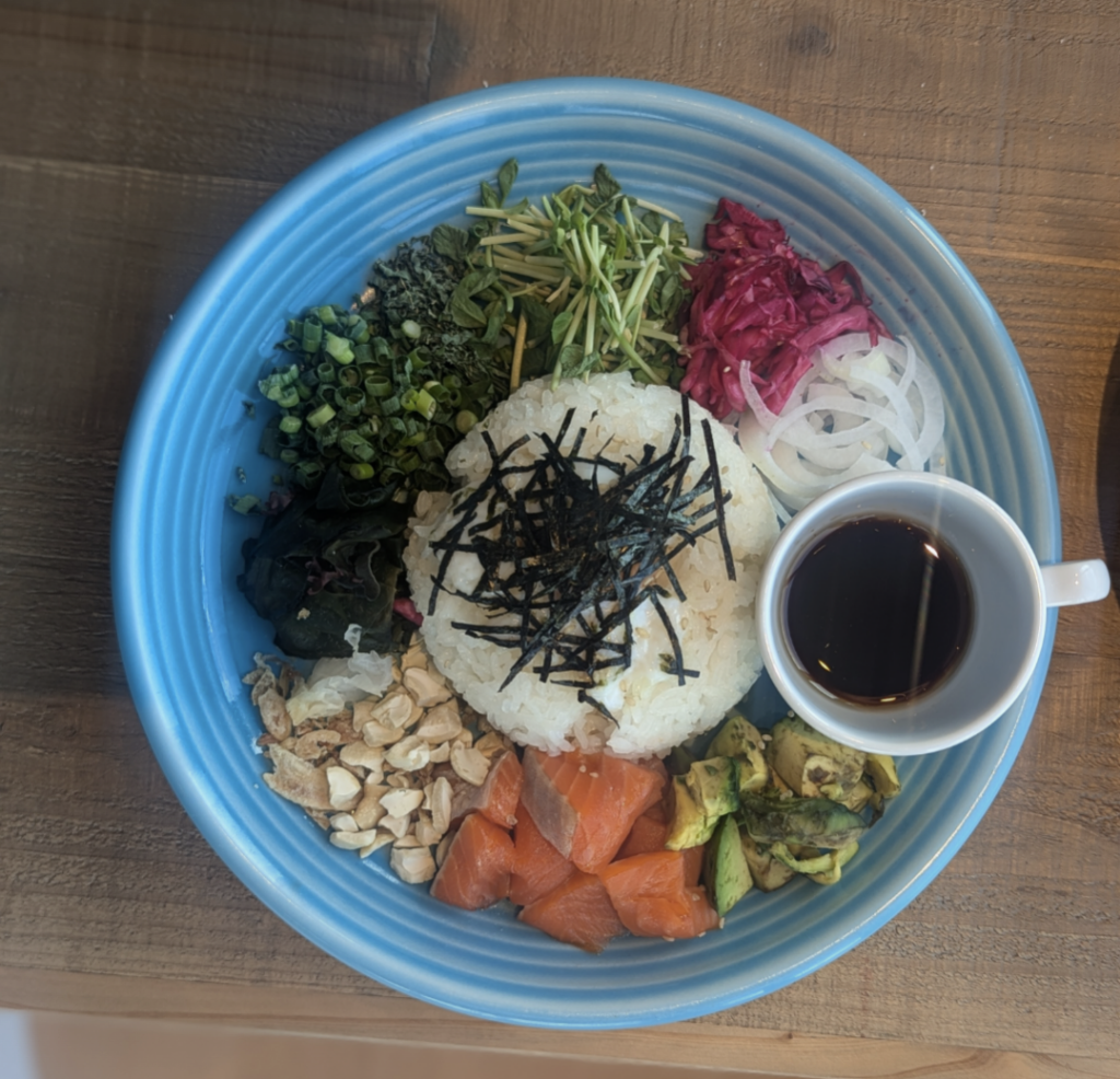 記者がいただいたのは、たくさんの具材がのった「モロカイアヒポキボール」。醤油ベースの自家製タレで和えたマグロやアボガドのサラダなどライスに合わせ好きな具材をチョイスしながら食べるワンプレートメニュー。パイナップルの果汁を加えた特製ソースをかけていただく爽やかな味なので、ボリュームがあるもののペロリと完食した。