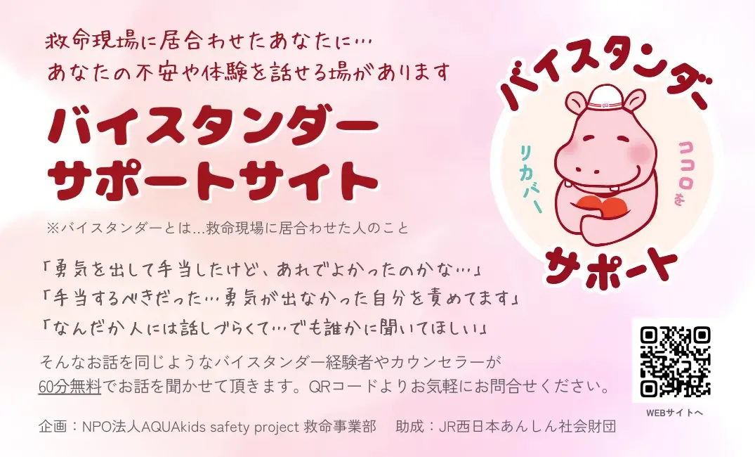 水難事故予防や小児応急手当の講座・ワークショップなどを行っているNPO法人「AQUAkids safety project」が9月9日の〝救急の日〟から、新たな取り組みとなる「バイスタンダーサポートサイト」を開設した。
