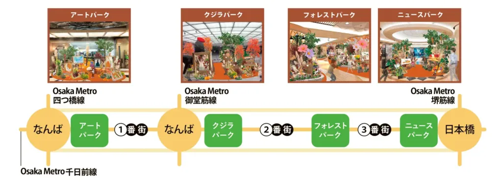 次世代のアーティストを応援するという思いを込めて、関西圏の芸術大学に通う学生に公募を行い、企画に賛同した大阪芸術大学、嵯峨美術大学、近畿大学文芸学部など、さまざまな大学や絵画教室から33点の作品が集まった。作品の展示場所は、同地下街の「アートパーク」「クジラパーク」「フォレストパーク」「ニュースパーク」の4パーク。