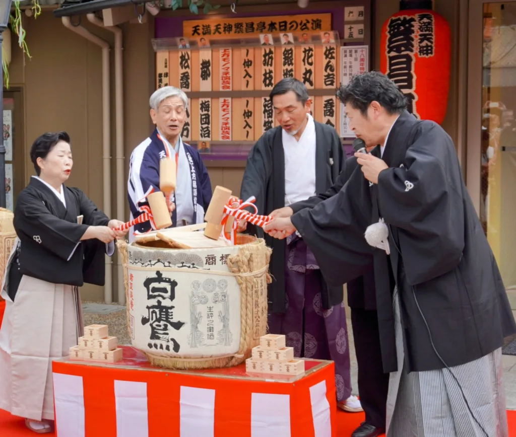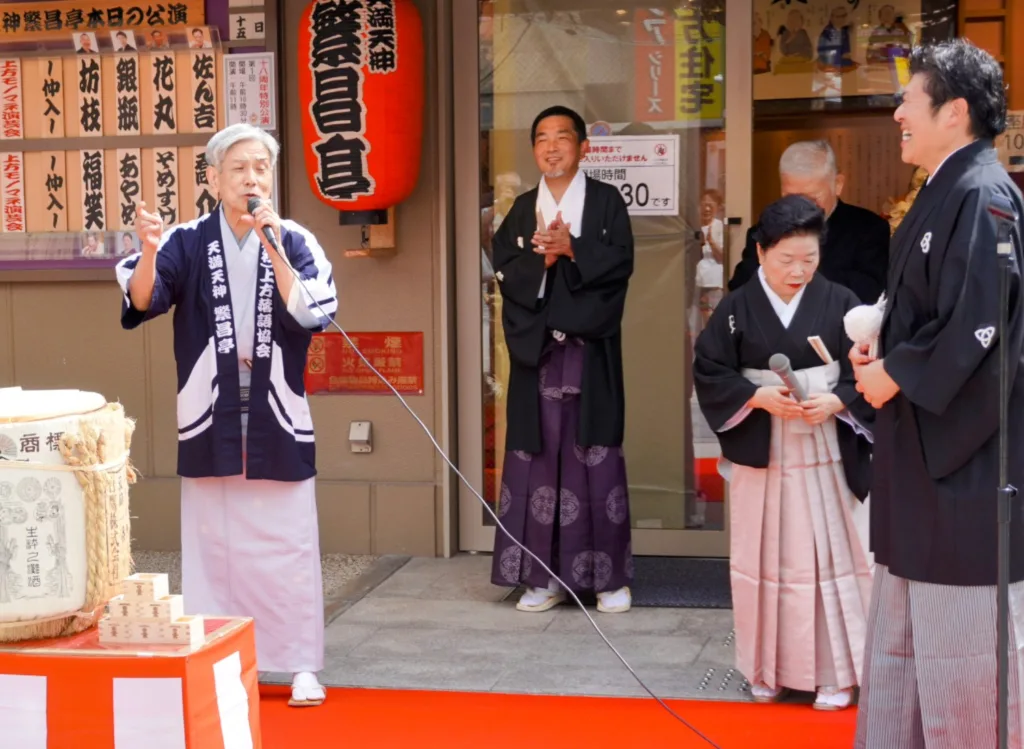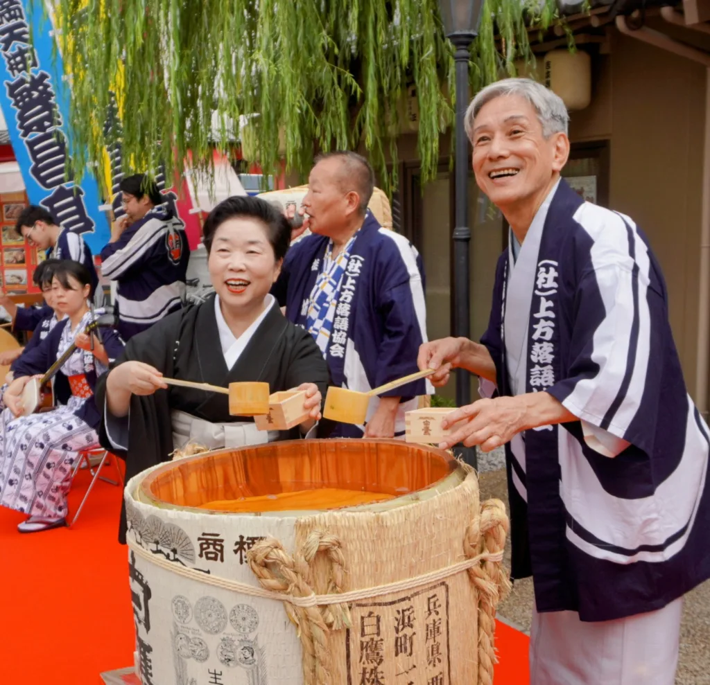 イベント・プロデューサーの露の都・理事をはじめ、副会長の桂米團治や敷地所有者の大阪天満宮・寺井種治宮司、地元天神橋筋商店街を中心に組織するNPO法人「上方落語支援の会」盛岡淑郎会長らが出席して鏡開きし、来場者らに祝い酒を振る舞った。