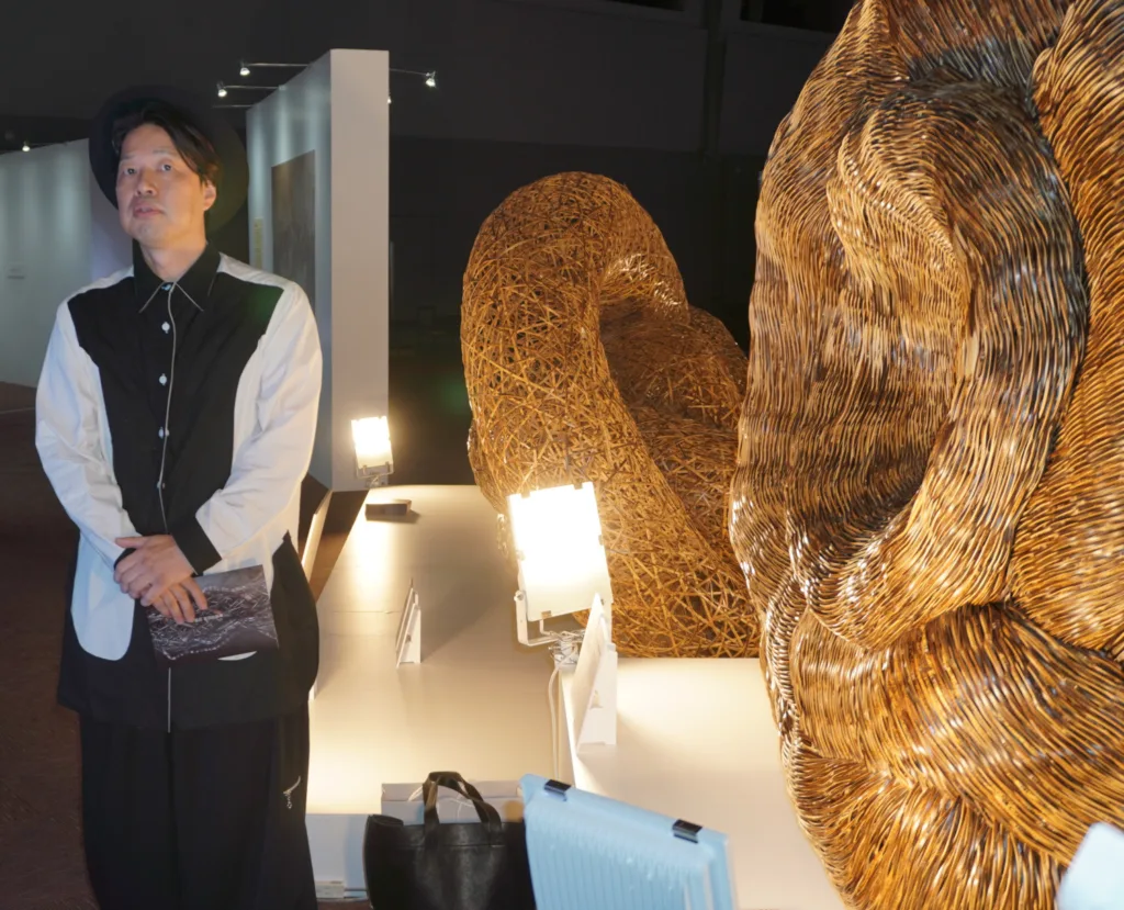 自然とエネルギー、命の循環を表現した作品を前にした田辺さんは「アート性の強い竹の表現力を大阪城ホールだけでなく来年の万博会場でも見て頂きたい」と語り、解けば素材へと帰る竹の特性をSDGsの精神と絡めながら説明。