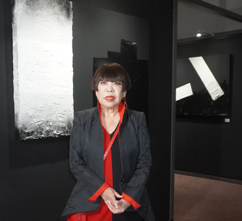 岸和田市出身のコシノさんは、白と黒を基調とした抽象画を出展。「ファッションデザイナーをしていますが元々はアートを目指していて、今は絵もやっています。普段は東京なんですが、もっともっと大阪のアートを盛り上げるお役に立ちたい」と意欲を示した。