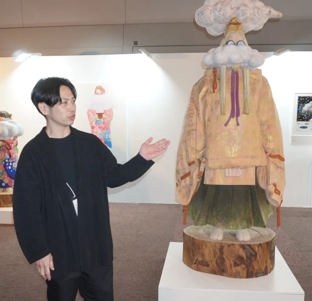 木彫に鮮やかな彩色が持ち味の野原さんは大小の作品を前に「大阪は妻の出身地でよく訪れる地。私の作品は台湾などアジアの国々で評価されることが多いが、形が分かりやすいのだと思う」と万博に向けインバウンド客に向けた意欲を示した。