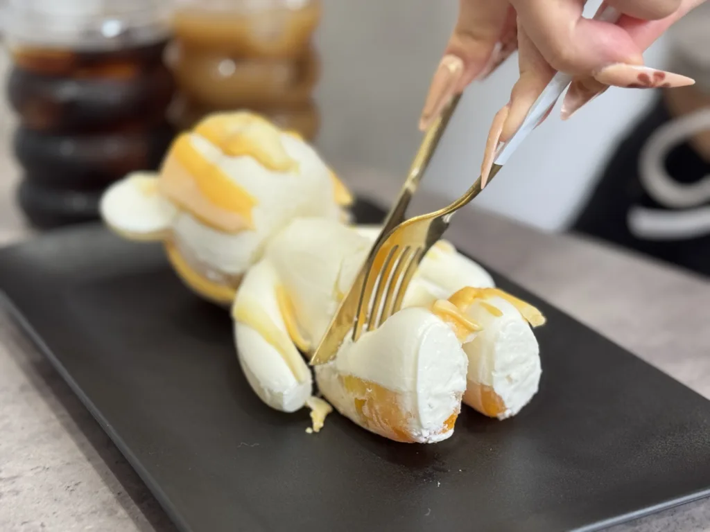 カフェで提供されるハーフクマケーキは2200円、ムースとフルーツゼリーで作られたくま型のデザートに、ブルー(ハワイアン)、オレンジ(マンゴー)、ブラック(竹炭)、ホワイト(チョコレート)、ピンク(イチゴ)、グリーン(抹茶)の6種類のソースから自分好みのカラーを選んで、自分だけの特別なケーキを作って食べることができる。