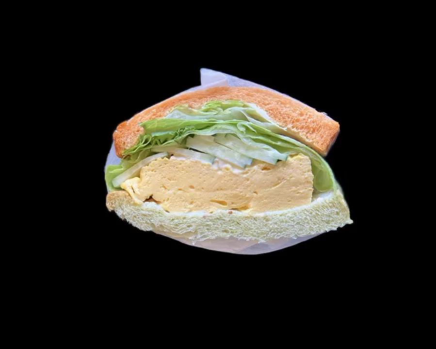 初出店。水分量をギリギリまで増やした、トマトとほうれん草の2種の食パンを使用。しっとり食感で優しくたまごを包む。
