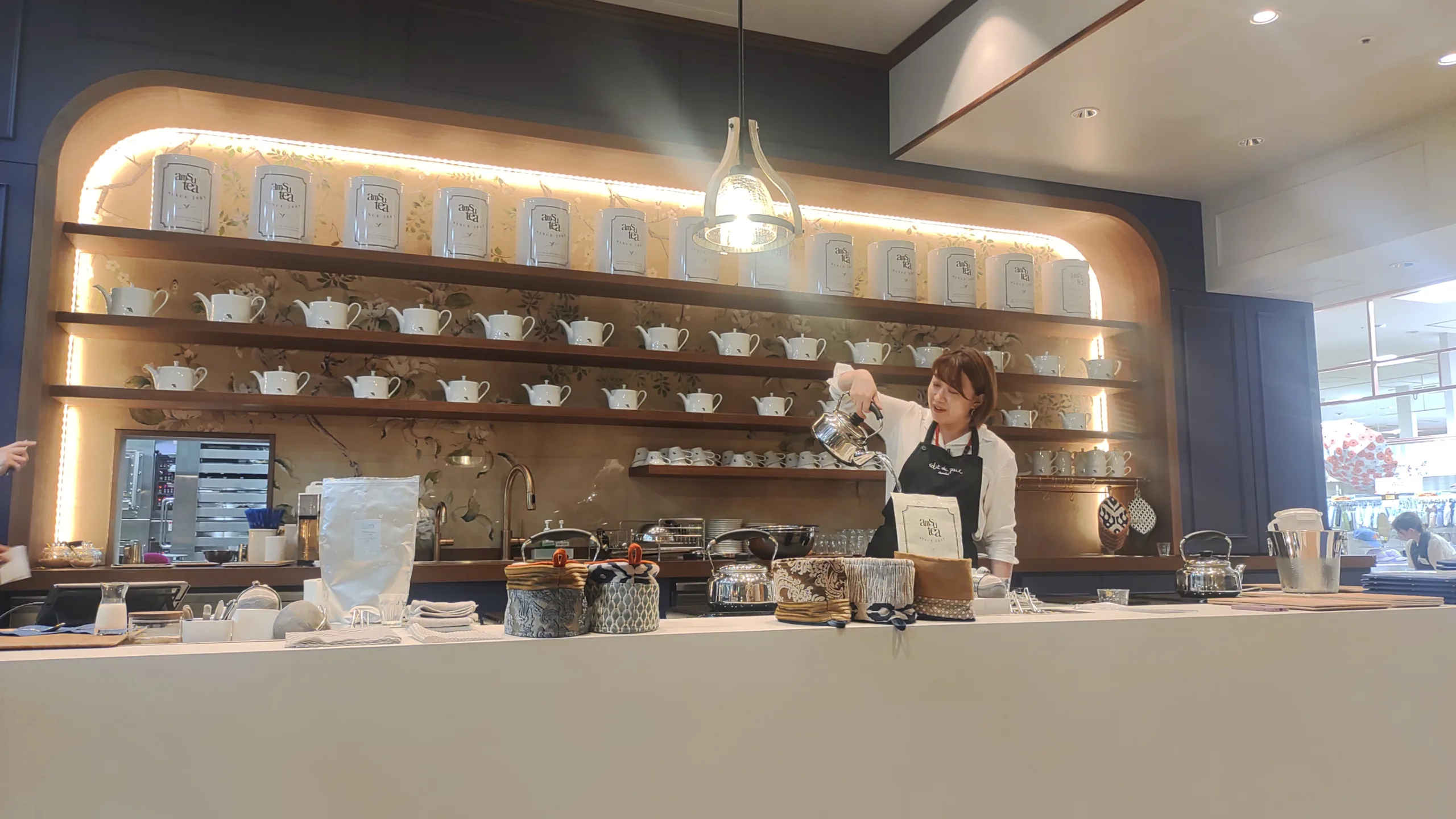 フレンチブルーをベースに統一された店内は、紅茶を用意するための大きなカウンターがあり、ガラス越しに製造スペースも眺められる。席数は43。気に入った紅茶を持ち帰り用に購入することもできる。