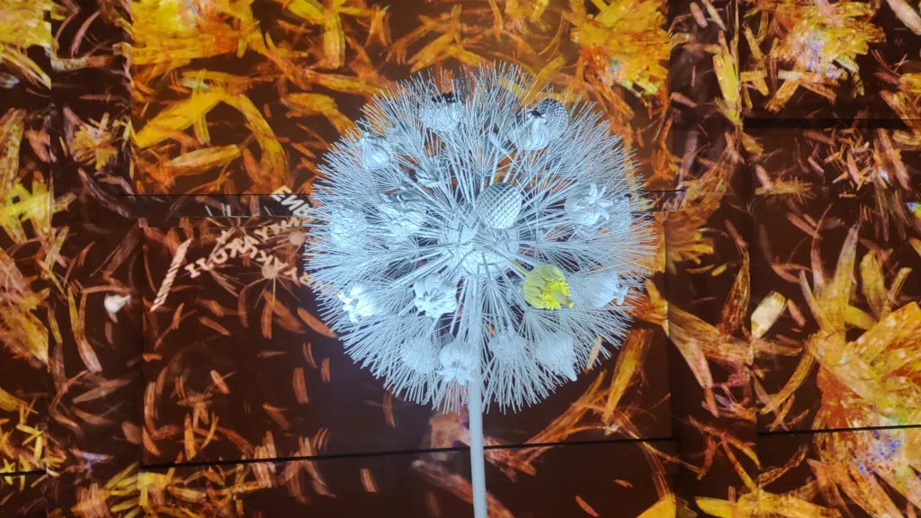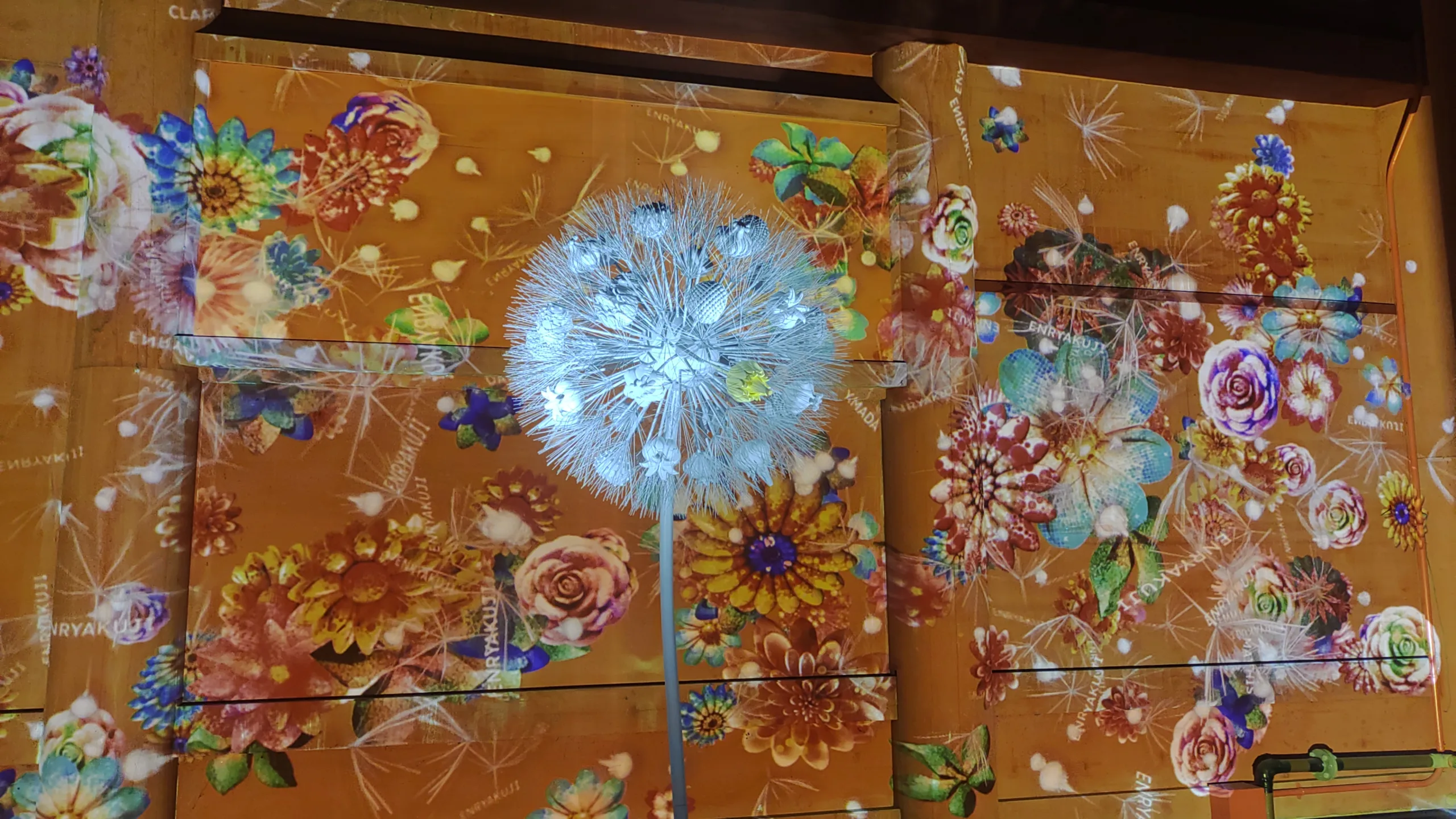 現存する最古の建築物である釈迦堂内の御本尊を囲むようにして作られた通路は照明と蝋燭(ロウソク)の光で装飾され、その通路の奥に大きなタンポポのオブジェを設置。1つだけある黄色いタンポポの綿毛に息を吹きかけると後ろの壁に投影されているプロジェクションマッピングの図柄が変化する演出。