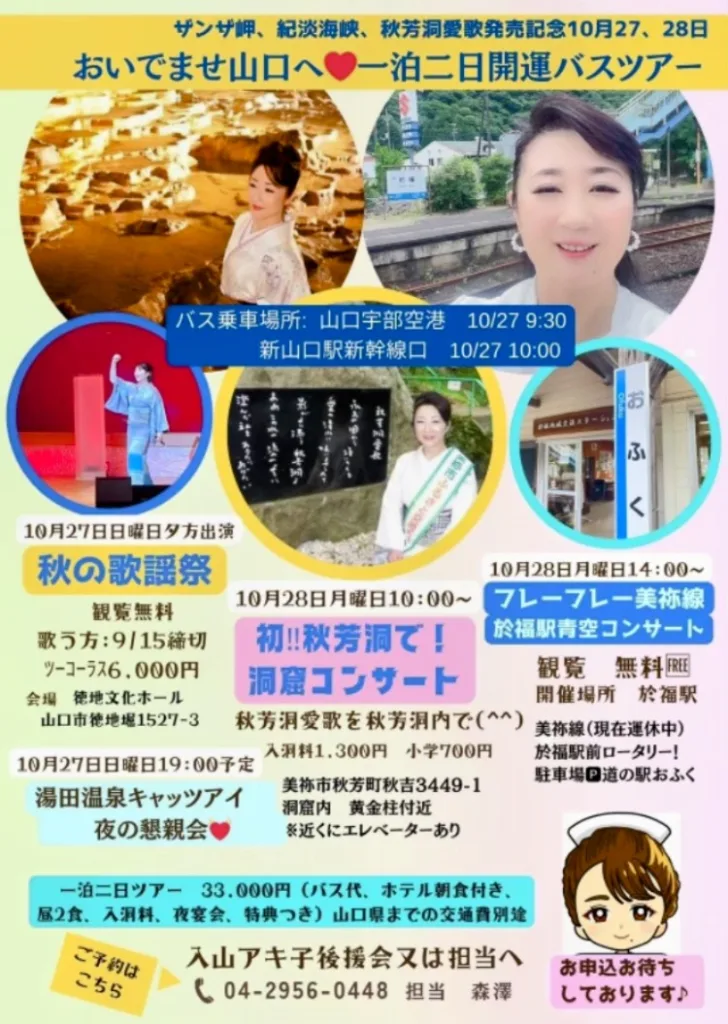 秋芳洞は国定公園内の特別天然記念物で通常イベントは困難。「そこで切手にも描かれている洞内黄金柱あたりが少し広くなっているので、そこでぶっつけ本番で歌わせて頂きます。美祢市ふるさと交流大使と山口県ふるさと大使をさせて頂いているご縁で、美祢市観光協会が全面協力して下さり実現しました」と背景を説明。