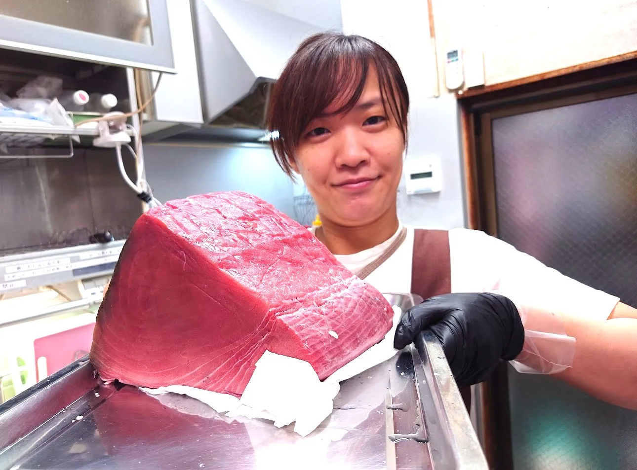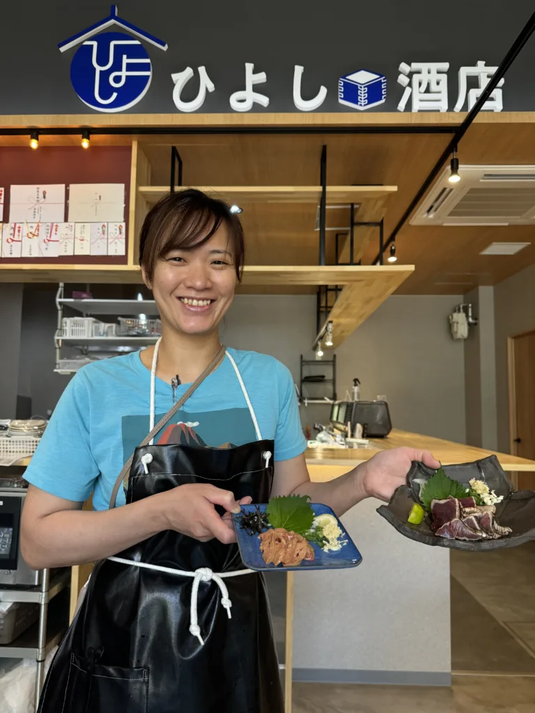 緑豊かな外観から店内へ入ると、酒蔵をイメージさせる開放的な高い天井と、酒瓶型のランプがやわらかく照らす空間で、落ち着いた雰囲気。調理は元保育士という異色の経歴を持つ店主の石原さんが手がけており、鮮度の良い天然物の魚料理が楽しめる。