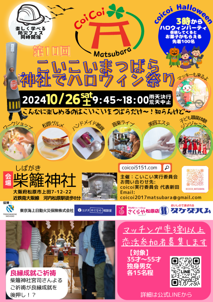 クリスマスやバレンタインと同様にすっかり定着したハロウィン。10月になると、巷ではさまざまな関連イベントが行われ、仮装や装飾を楽しむ人も年々増えている。今週末のイベントをお探しの人におすすめしたいのが、10月26日に柴籬神社(松原市)で開かれる「こいこいまつばら」だ。