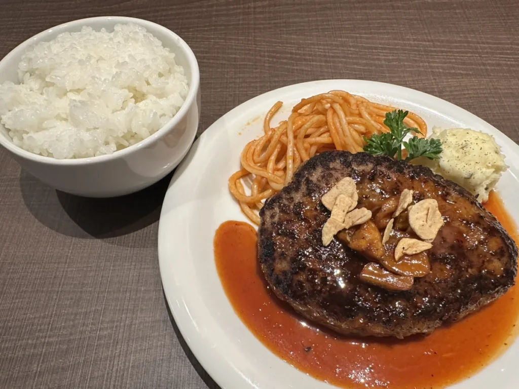 店主のこだわりハンバーグは、たっぷり250gで、ライスの大盛無料。キッズメニューやテイクアウトもあり。