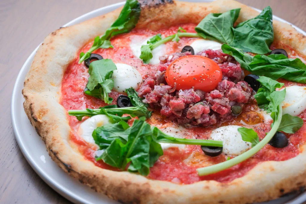看板商品は、本場・イタリアから取り寄せた薪窯で丁寧に焼き上げるナポリピッツァ。中でも、芳醇な香りと旨味を持つポルチーニ茸をソースに使い、ルッコラ、モッツァレラチーズ、カジキマグロの自家製スモーク生ハムをトッピングした「プロシュット スパーダ」は同店を象徴するピッツァだ。