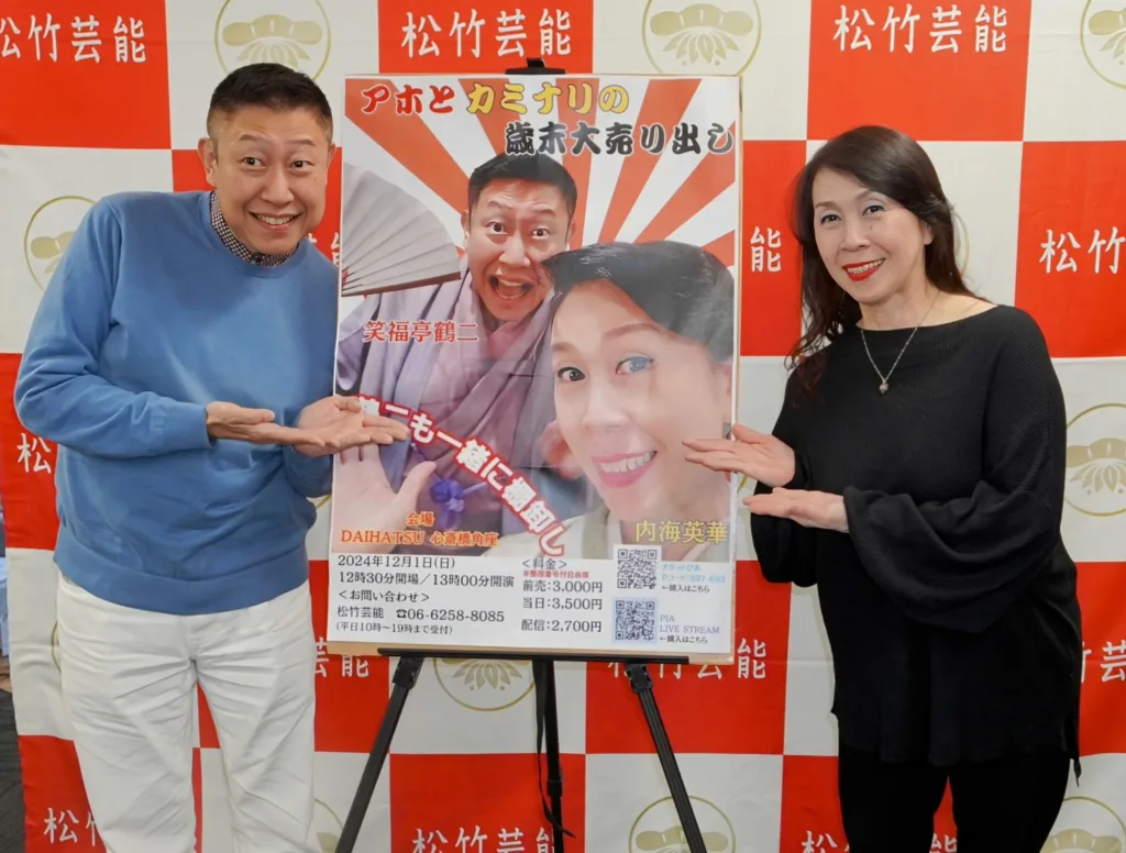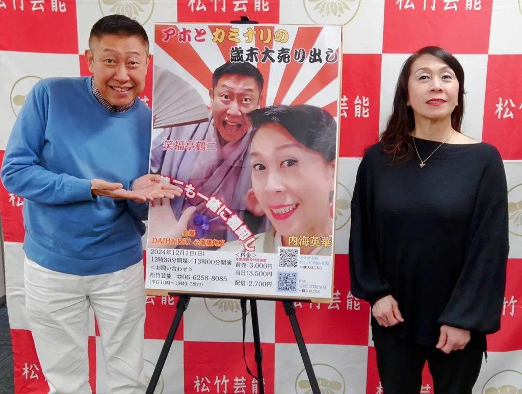 ラジオ大阪のバラエティー番組「hanashikaの時間。」(月~木曜夜6時)の木曜パーソナリティーとしてコンビを組む上方落語家・笑福亭鶴二(56)と三味線漫談〝女道楽〟継承者で上方落語協会理事、内海英華(64)が番組そのままのノリで得意芸とトークを繰り広げる「アホとカミナリの歳末大売り出し~鶴二も一緒に棚降ろし」が12月1日午後、大阪・心斎橋角座で行われる。