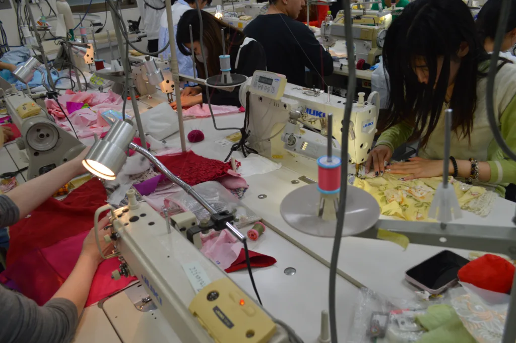 上田安子服飾専門学校ファッション・プロデュース学科の生徒が「アニバーサリーパーティー」をテーマにデザイン案から考え、KINJIから古着の提供を受け、バルーンを使いながら、メインとなるマネキン3体の衣装を製作した。各々が手分けして古着の生地を継ぎはぎし、テーマに沿った衣装を作り上げた。