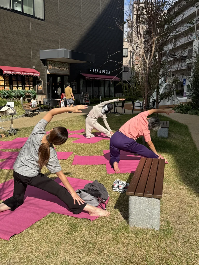 開放的な屋外芝生の上で心地よいヨガを楽しめ、初心者でも気軽に体を動かす気持ち良さが体験できる。参加者からは、「毎回違うポーズも教えてもらる。丁寧な指導でありがたい」と好評。買い物ついでにふらっと立ち寄ってリフレッシュしてみては。