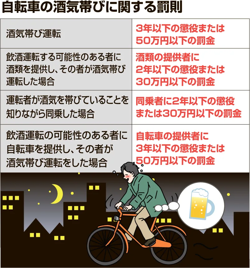 今回の改正で「自転車の酒気帯び運転」以外に、自転車運転者への「酒類の提供者」「自転車提供者」「同乗者」も罰則の対象となった。大北調査官は「自動車の罰則が強化されているのと同様に、自転車も加わったと認識してもらいたい」と話す。