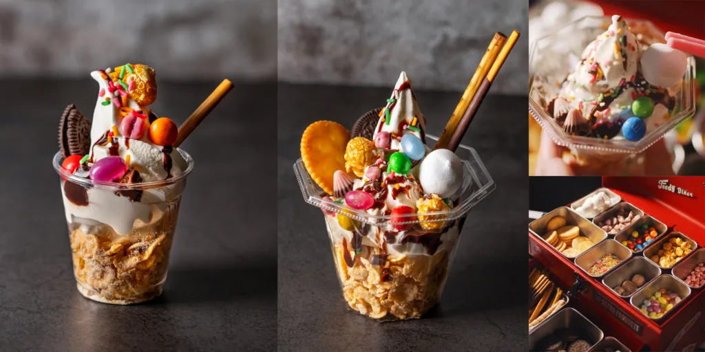 映えるビジュアルとボリュームを兼ね備えたオリジナリティあふれるメニューのほか、ドリンクもSNS映え・シェアしたくなる楽しいビジュアルが揃う。制限時間内はトッピングし放題のカスタムサンデーや食べ放題ポテトをはじめ、エンタメたっぷりなデザートやサイドメニューもおすすめだ。
