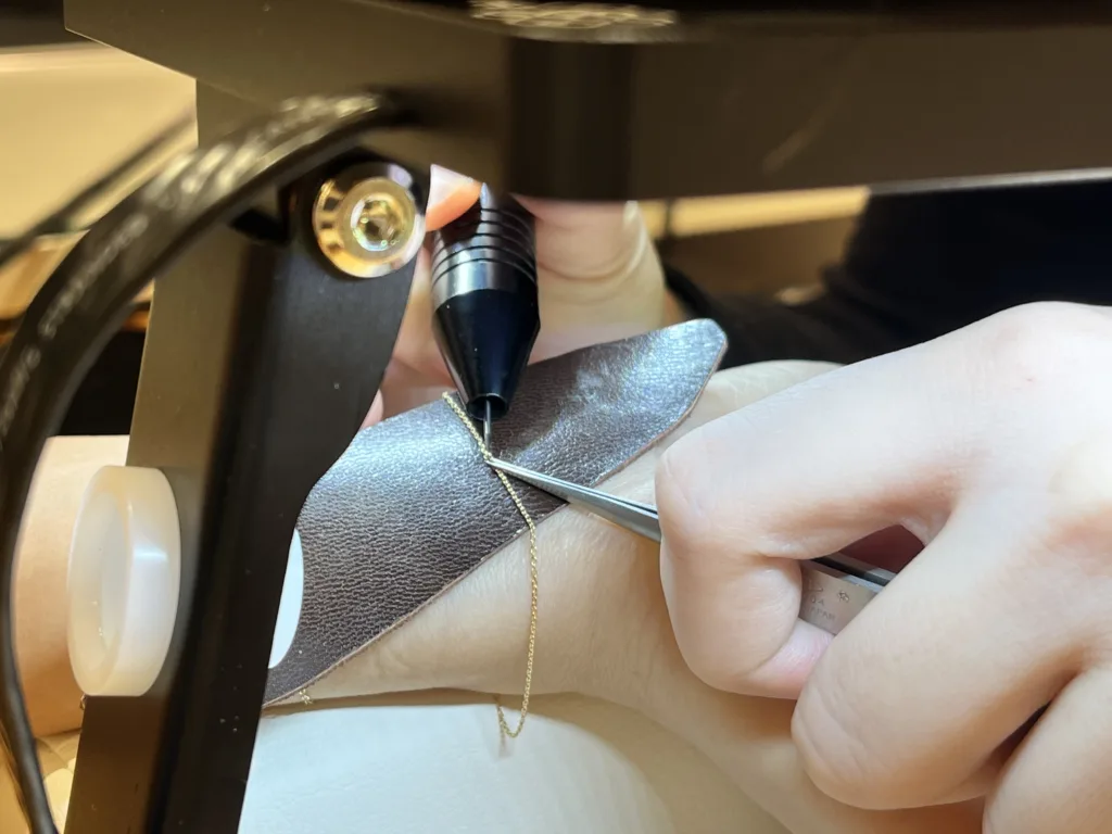 「一生外さないと、困るシーンがあるのでは?」と思うだろう。例えば、病院でMRIに入る時、金属はつけたままにできない。そんな時は、ニッパーで溶接部分をカットして外すことができ、カットしたチェーンは公式HPより問い合わせをすれば、通常のブレスレットして使用できるように金具をつけて届けてくれる(料金は8,800円)。また、サウナなど高温な場所に行くときは、チェーンをタオルで覆うなど少し注意は必要。その他は特に困ることはなく、温泉に入っても色や質感が変わることはない。