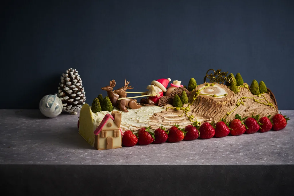 もう一つパーティーにぴったりなケーキは、なんと全長が45センチほどあるブッシュドノエル「ゆめものがたり」だ。高さも約12センチあり、そのボリューム感に圧倒される。