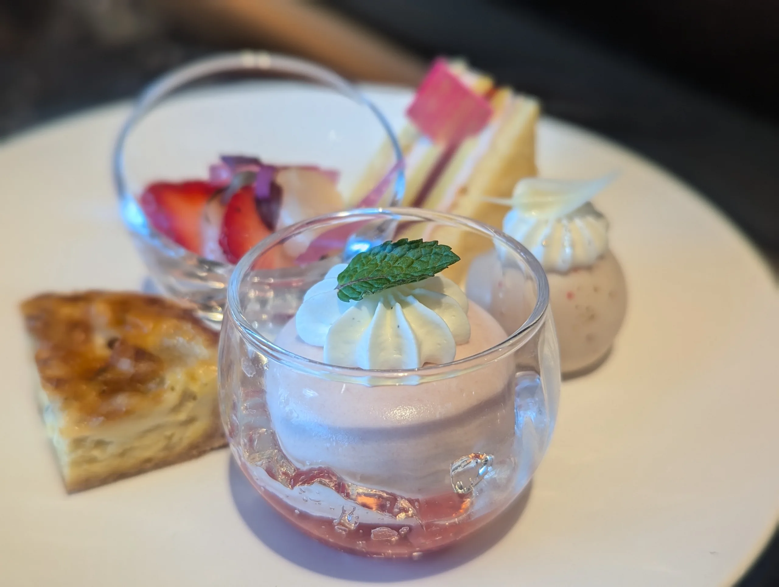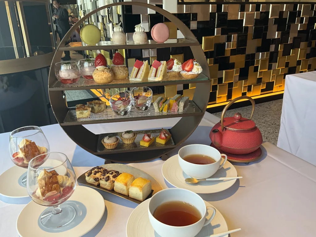 「あまおういちご」を使ったスイーツのほかにも、かわいいスイーツやセイボリーが4段の飾り棚にところ狭しと置かれていて、見ているだけでも心が躍るアフターヌーンティー。