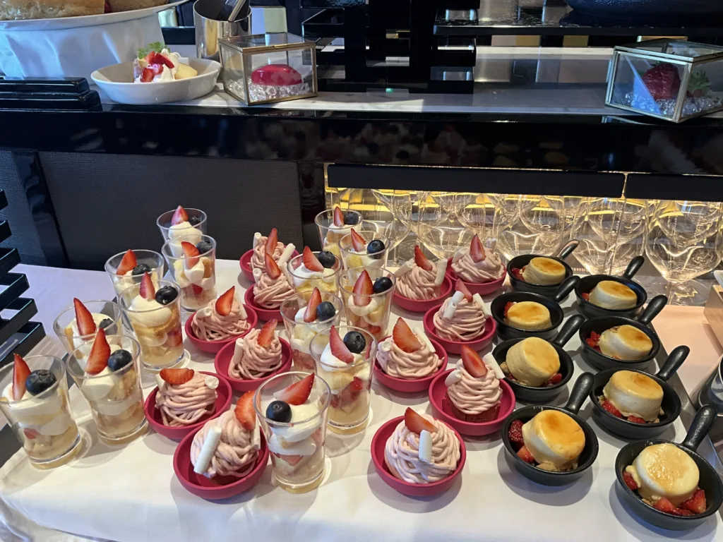 ランチタイムに「あまおう」を使ったデザートビュッフェを開催。いちごの果実をそのまま味わえるのはもちろん、エクレア、タルト、ロールケーキなどホテルパティシエの小野寺美江子さん特製のいちごのデザートを心ゆくまで味わえる。自分で盛り付けるコーナーもあり、たっぷりシロップを染み込ませた甘くてふわふわと柔らかい「ババ」がおすすめ。