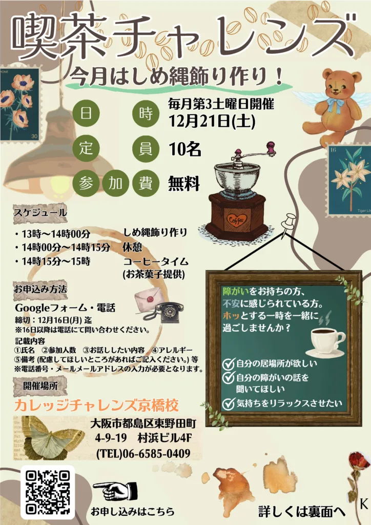 毎月第3土曜、京橋の就労支援事業所、カレッジチャレンズ京橋校ではテーマを決めた喫茶イベントを開催している。今月21日は正月のしめ縄飾りづくりをしながら、まったり珈琲と焼き菓子を楽しめる。参加無料。不安感のある人を主な対象にしている。