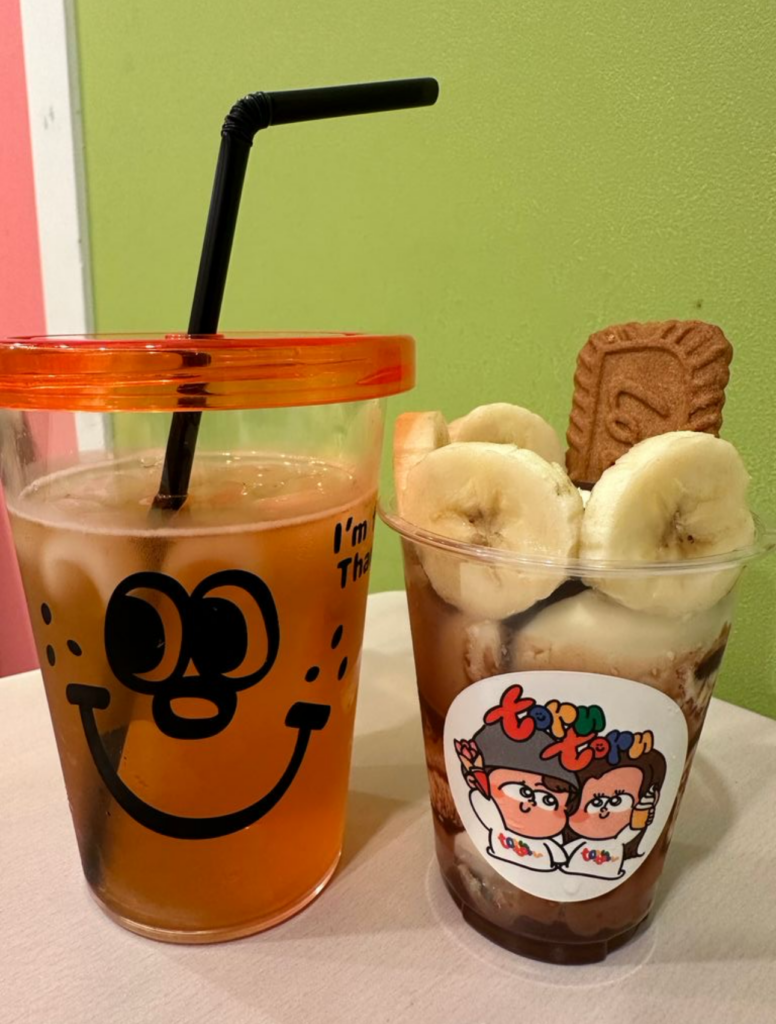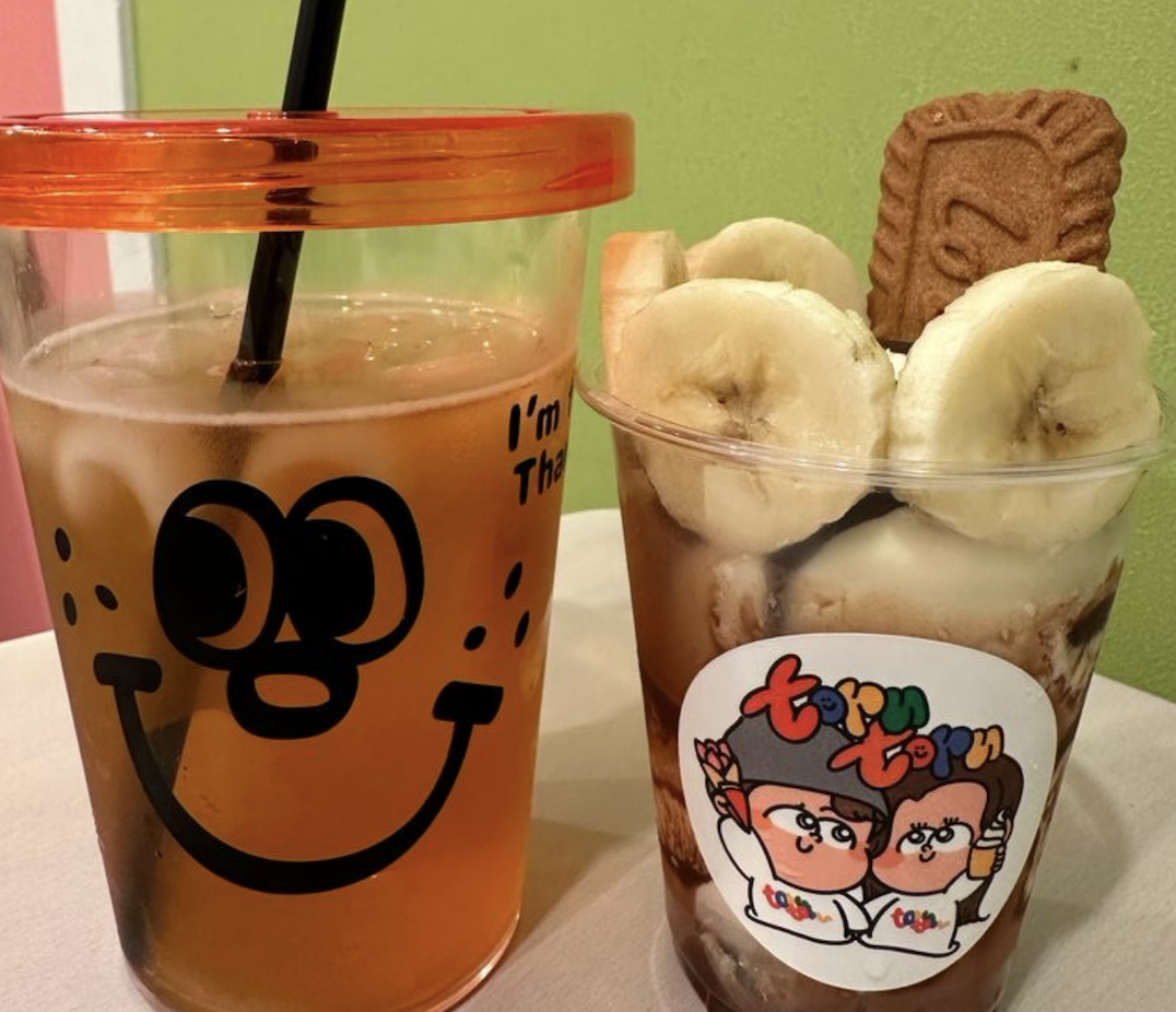 濃厚北海道ミルク(480円)をベースに、いちごやバナナ、旬のフルーツ、チョコ、キャラメル、マシュマロなどのトッピングが楽しめる。カップはクレープ好きのオーナー堤涼太さんとアイス大好き佳愛(かのり)さん夫妻のポップでキュートなイラストつきだ。