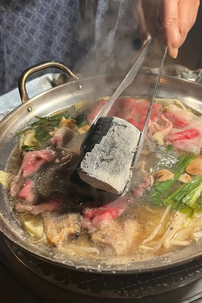 「ホルモンと特選牛の炭鍋~白味噌ゆず胡椒ダレ~」は、「脇彦商店の特選牛を焼肉と鍋で堪能できるコース」で提供される。もつ鍋としゃぶしゃぶを合わせた新感覚のメニューで、さっと湯に通した特選牛の牛肉に熱した炭を当て、香り付けをして仕上げる。スープは、店内仕込みのオリジナルブレンドだしをベースに、炭火で炙(あぶ)った名物の「粕漬け小腸」と自家製の白味噌ゆず胡椒ダレを加えるなど、細部にこだわりが光る。