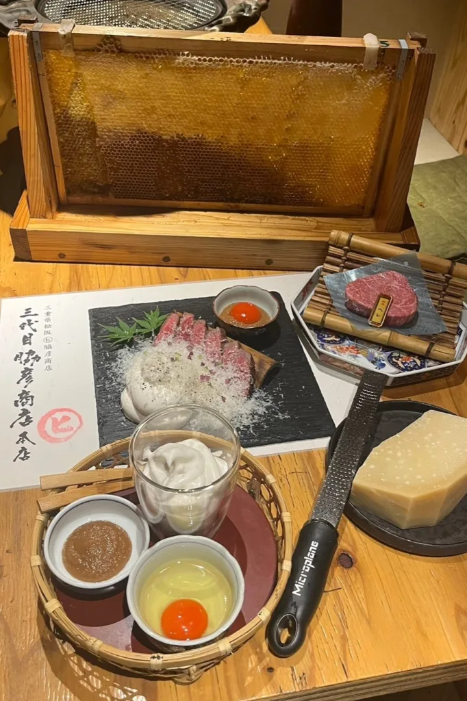 「牛ヘレ肉のステーキ~泡雪はちみつソース~」は、焼肉と肉料理の両方を楽しめる「脇彦コース」の創作肉料理として登場する。仕上げに「イタリアチーズの王様」と称される「パルミジャーノ・レッジャーノ」を雪のように削る盛り付けは、冬にぴったりの演出だ。ステーキソースも素材から厳選。ハチの巣から採ったハチミツを仕入れ、目の前で卵白と混ぜ合わせてつくる「泡雪はちみつソース」はおいしさに加え、喉や疲労などにもうれしい働きがあるとか。