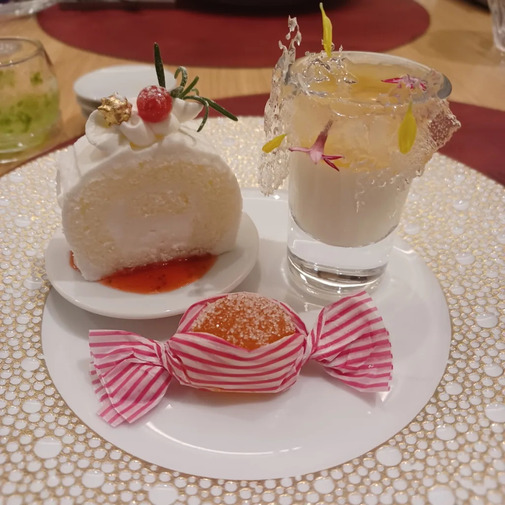 まずはウェルカムドリンクの「あめちゃんスパークリング」がお出迎え。グラスの上には雪を表現した綿あめがセットされ、串を抜いてドリンクに落とすとシュワシュワッと溶ける様子が楽しめる演出がニクイ。赤と緑のクリスマスカラーシロップで色付けした氷や、グラスのふちに付けた砂糖は雪をイメージしている。早くもクリスマスのワクワク感を盛り上げる。炭酸の爽やかな刺激と柑橘系の香りが絶妙にマッチ。ノンアルコール「あめちゃん白ぶどうスパークリング」もあり、記者のようにお酒が苦手な人も楽しめる。ドリンクを片手にロビーに飾られている「あめちゃんツリー」と一緒に写真を撮ってSNSに投稿するのも面白そう。