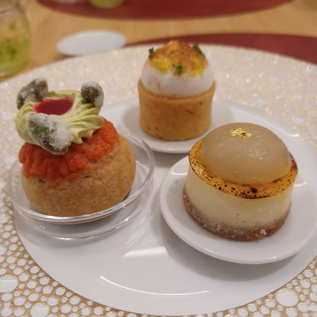 トマトやブロッコリーをコンソメで固め、丸いあめちゃんの形に仕立てた「あめちゃんサラダ」はバジルソースが良いアクセントに。ほうれん草のムースの上にローストチキンがのった「冷やし飴ソースのチキンとほうれん草ムース」も楽しめる。