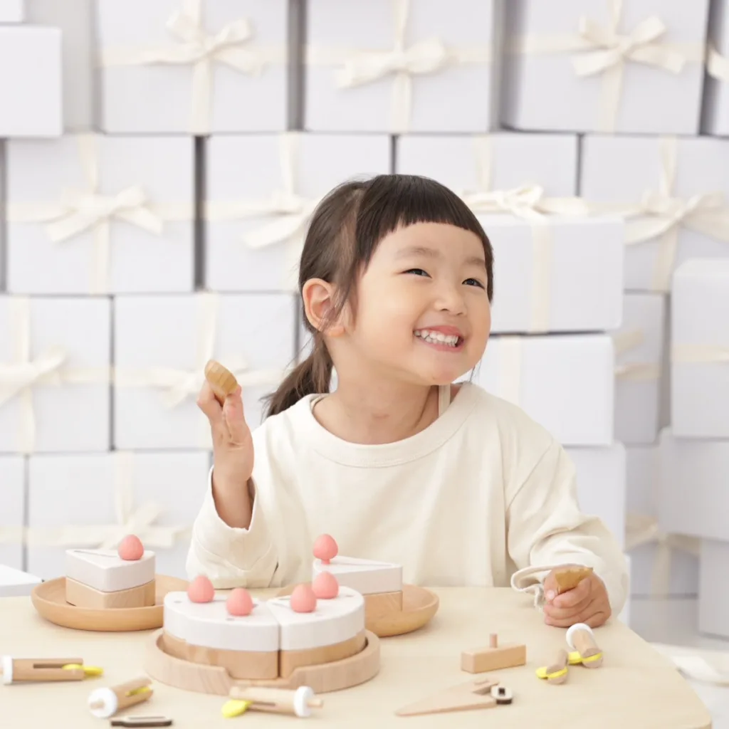 〝見て・触って・遊んで楽しい!木製ケーキ〟天然木の温かみのある質感と、カラフルなデザインの知育おもちゃ。ケーキを切り分けたり、トッピングを飾ったりと、子どもの創造力を育む。「ほんものみたいに息を吹きかけると火が消える?」インテリアとしても美しく、部屋を華やかに彩る。