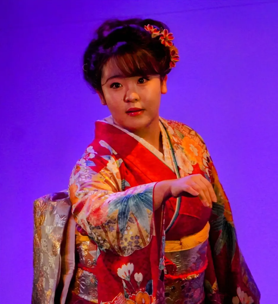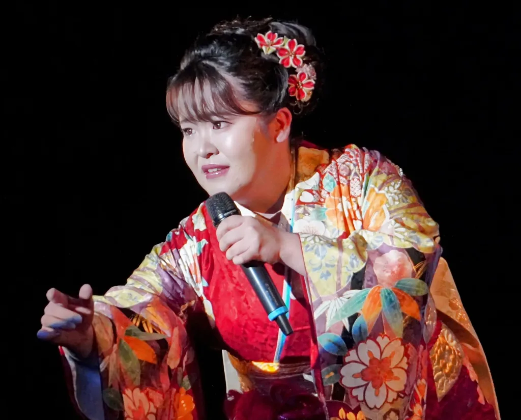 朝花は舞台に現れるとまず挨拶と共に地元鳥取のPRから。「私の生まれ故郷は大山の豊かな大自然を臨み、実家から少し行けば鬼太郎ロード。県内には有名な鳥取砂丘や倉吉白壁土蔵群があります」と目を輝かせて説明。