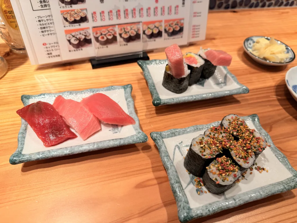 名物の「トロ鉄火巻ハーフサイズ」(写真上)、「本マグロ三昧」(写真左)と、立ちすし限定の「ゴマき」(写真下)