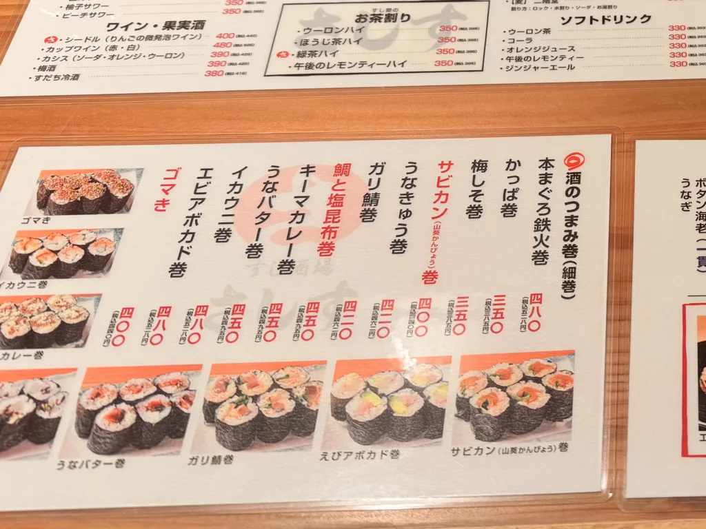 同店の名物メニューである「とろ鉄火巻」や「とろたく巻」「とろサーモン巻」は、立ち飲みスタイルの同店ならでは(限定)でハーフサイズを提供している。また、カレー風味の「キーマカレー巻」や色鮮やかなゴマをまぶした「ゴマき」といった変わり種の細巻も限定メニューとして展開。