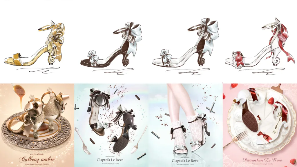 「MAYLA」の特徴は、モノを概念化してシューズのデザインにしているところだ。題材となるモノを「まね」するようなデザインではなく、そのモノの要素を分解し、あらゆるパーツに「らしさ」を散りばめたようにデザインされている。このデザイン手法が、世界観やキャラクターを重視するアニメやゲームといったコンテンツとマッチすると考え、作品とのコラボ商品(同社では「プロデュース商品」と呼称)の展開を始めた。すると、「今までにないグッズ」として人気を集めた。